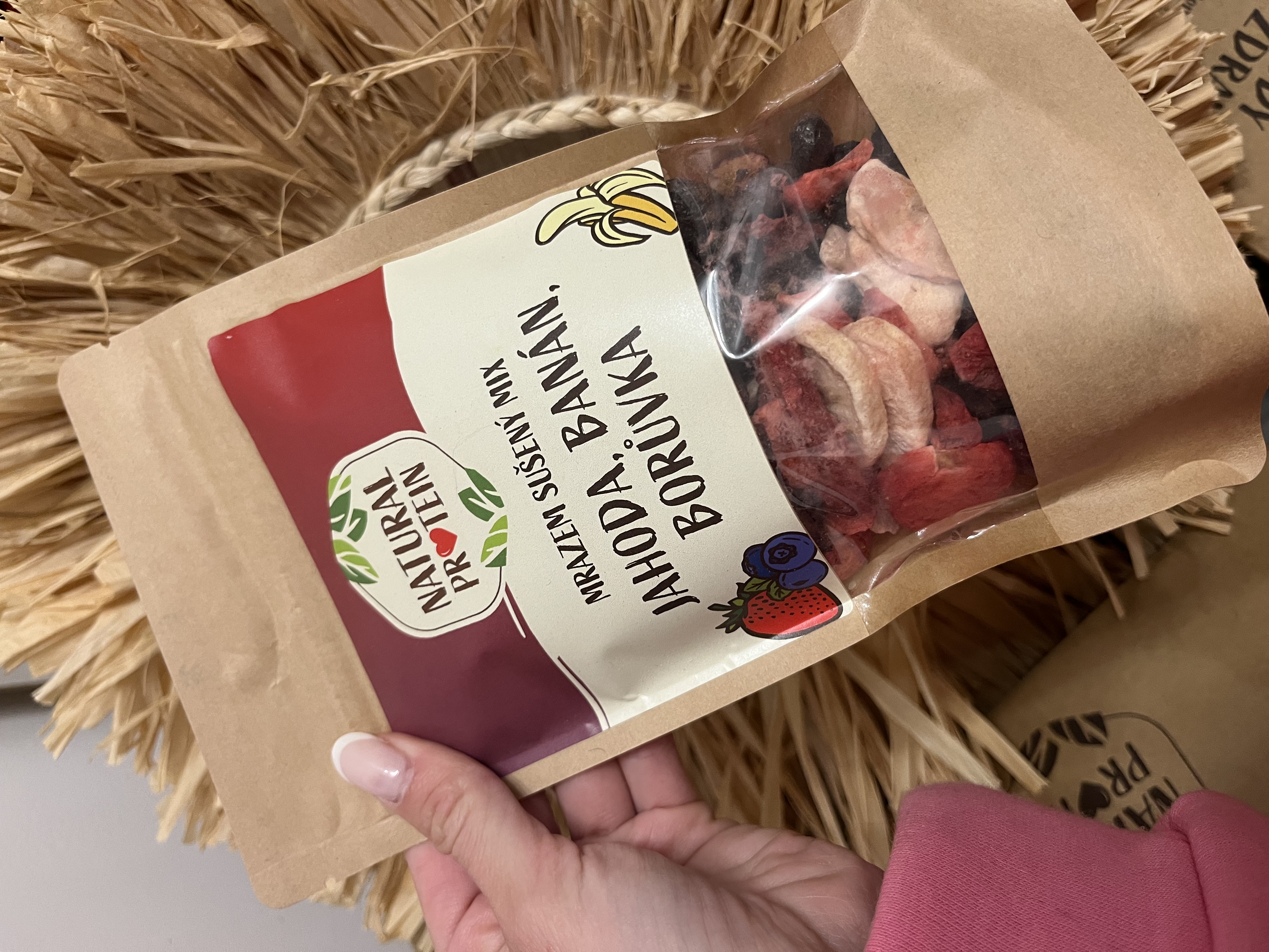 Dopřejte si pravé ovoce kdykoli a kdekoli, bez zdlouhavého krájení nebo loupání. Křupavé kousky slaďoučko-kyselých jahod, borůvek a banánů jsou ještě o kus lepší než ty čerstvé. Fakticky! Díky lyofilizaci (sušení mrazem) mají totiž výraznější chuť, vůni i barvu a doslova se rozplývají na jazyku. Navíc si uchovaly všechny důležité vitamíny a minerály, takže je to parádní zdravá svačinka plná živin pro děti i dospělé. Ovoce můžete mlsat samotné, nebo s ním dochuťte jogurt, müsli, kaši nebo třeba protein. Balíček obsahuje 100% čisté ovoce, žádný přidaný cukr, barviva, aromata ani konzervanty.